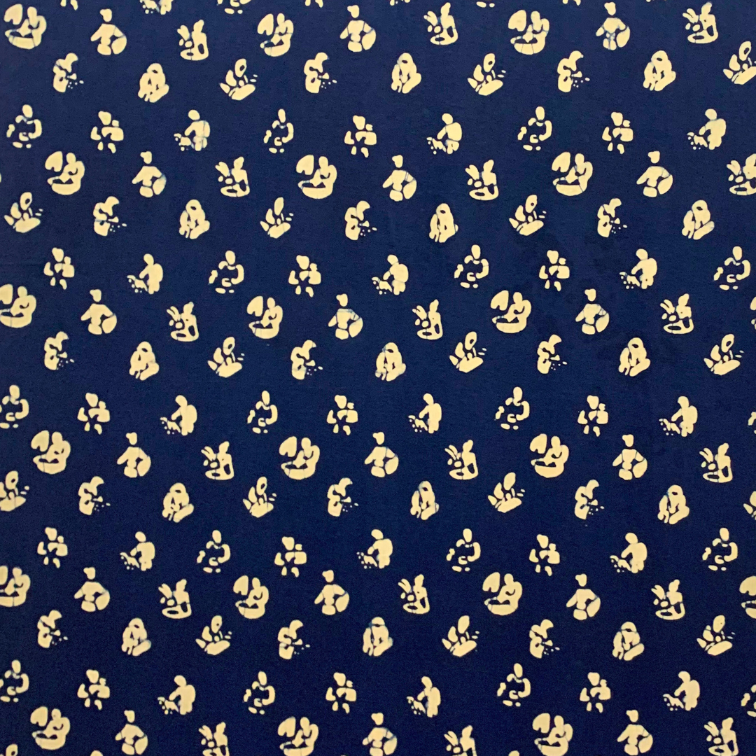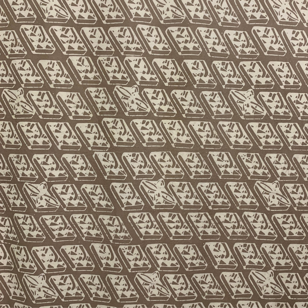 The design of the figures was inspired by figurative designs and illustrations seen on old batik cloths. For centuries now, geometric, floral, and arabesque motifs have been the norm in Malaysian batik design due to a perception in Islam that the decorative depiction of human figures and animals is a form of idolatry. This design is our way of celebrating the tukang who work with us and involving them in the results of their own creation. Due to the bleeding of the hot wax during the stamping process, some of the contours of the design were lost, resulting in forms that are more abstract and fluid (perhaps this helps to mitigate its transgressive nature!).