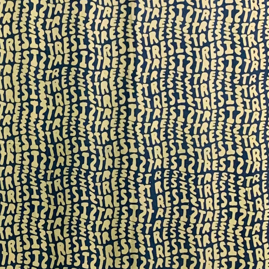 In an age of mechanical reproduction and digital instantaneousness, batik may be easy to discount, but the wax resistance technique is, in fact, a long process that requires multiple repetitions of the dyeing and wax applications. Just like the work of political resistance, batik is a slow process that sometimes requires months to show its results. The second piece in our Crafting Resistance batik series turns the word “Resist” into a typographic pattern inspired by calligraphic batik designs found on old specimens of kain limar.
