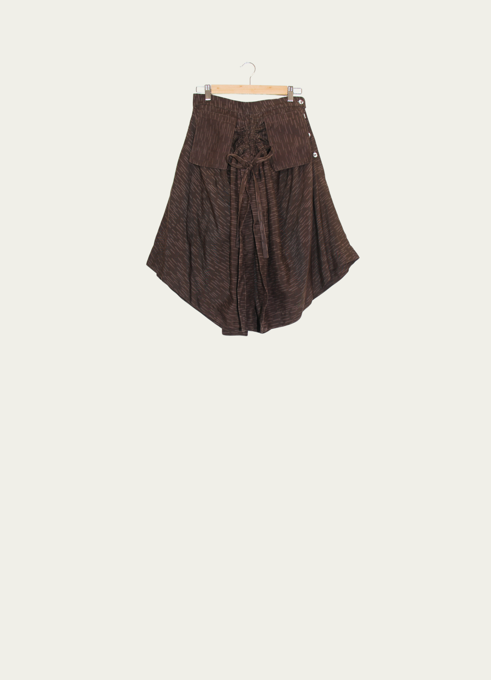 Crafted from hand-stamped batik on medium-weight, breathable TENCEL Lyocell fabric, this batik skirt balances versatility with thoughtful design. Adjustable pouch pockets can be styled at the front, side, or back, while drawstrings allow for a personalised silhouette. The line batik motif enhances movement, especially when cinched to create subtle gathers. Reverse-sewn mother-of-pearl buttons add a distinctive touch, making this piece both practical and refined—a timeless wardrobe staple.