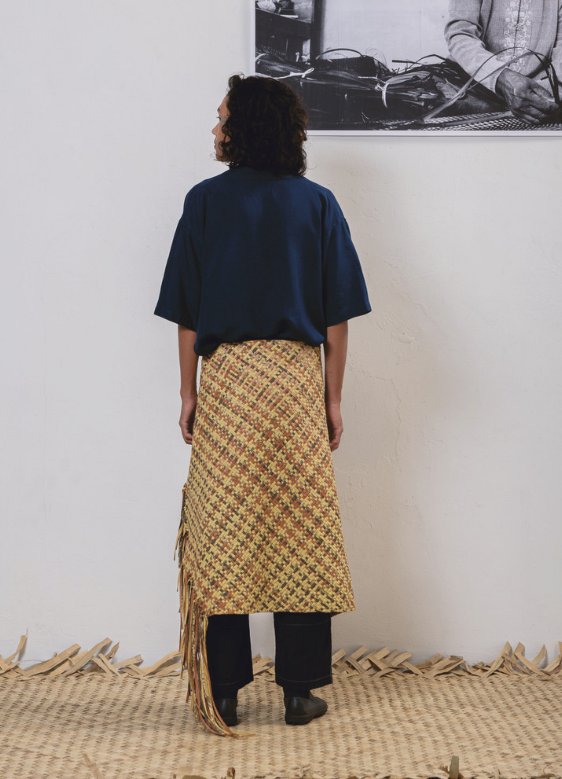 This 1-of-1 wrap skirt was hand-woven by skilled mengkuang weavers using the traditional gadas weaving technique, similar to that of a mengkuang mat. Edges are left raw. A total of 314 meters of cotton strips were used, made from naturally dyed cotton. The yellow hue came from pomegranate skin, while the brown colour was derived from mangrove bark.